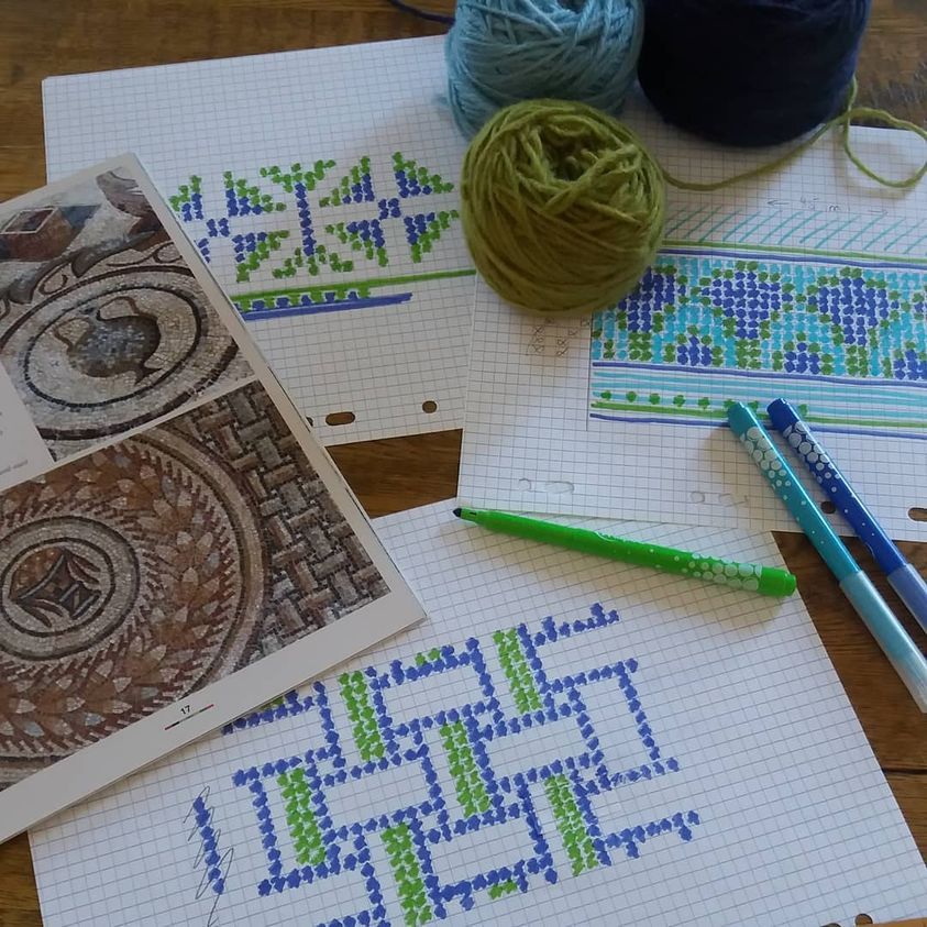 Recherches de motifs à partir de mosaïques antiques : je travaille à partir des mosaïques magnifiques de la villa de Séviac qui faisait partie de la cité antique Elusa (aujourd'hui Eauze dans le Gers). Une fois le confinement passé je vous encourage à aller voir cette merveille ! Je transforme quelques motifs de frise pour réaliser des décorations de textiles ... je pense utiliser ces motifs pour tricoter en jacquard des mitaines et/ou des chaussettes, je ne sais pas encore ... Comme nous avons très peu d'artefacts textile de cette époque, j'imagine des décors à partir de mosaïques, poteries, objets métalliques qui, eux, sont parvenus jusqu'à nous. Le tricot est attesté par des pièces de fouille en Egypte : tricot avec une seule aiguille (naalbinding) mais le rendu visuel avec le tricot moderne en jersey est identique (et beauuuucoup plus rapide !). Je teste tout ça et je vous tiens au courant !