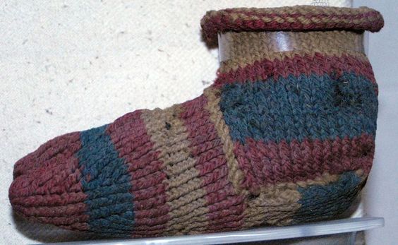 Pour preuve cette pièce de fouille trouvée en Egypte, conservée par le sable du désert. Ces chaussettes coptes ressemblent à des chaussettes japonaises avec cette séparation au milieu des orteils, car les Romains installés dans cette région de l'Empire portaient des espèces de tongues en cuir pour marcher dans le sable. Elles sont réalisées en tricot mais avec une seule aiguille (méthode appelée naalbinding car reprise ensuite par les peuples scandinaves).